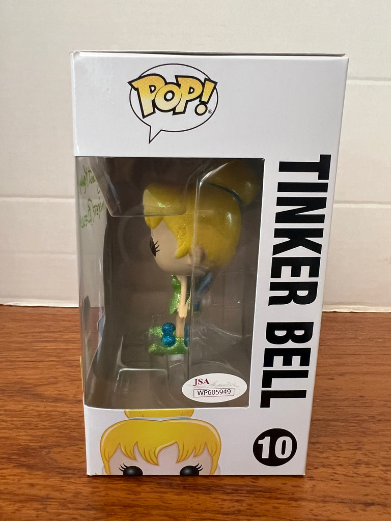 This is a Margaret Kerry autograph Tinker Bell Funko POP! She signed this in green paint pen. She is known to work as a model for Tinker Bell in the Walt Disney Picture animated feature Peter Pan. She included an “Tinker Bell” inscription. Comes with JSA certifications.